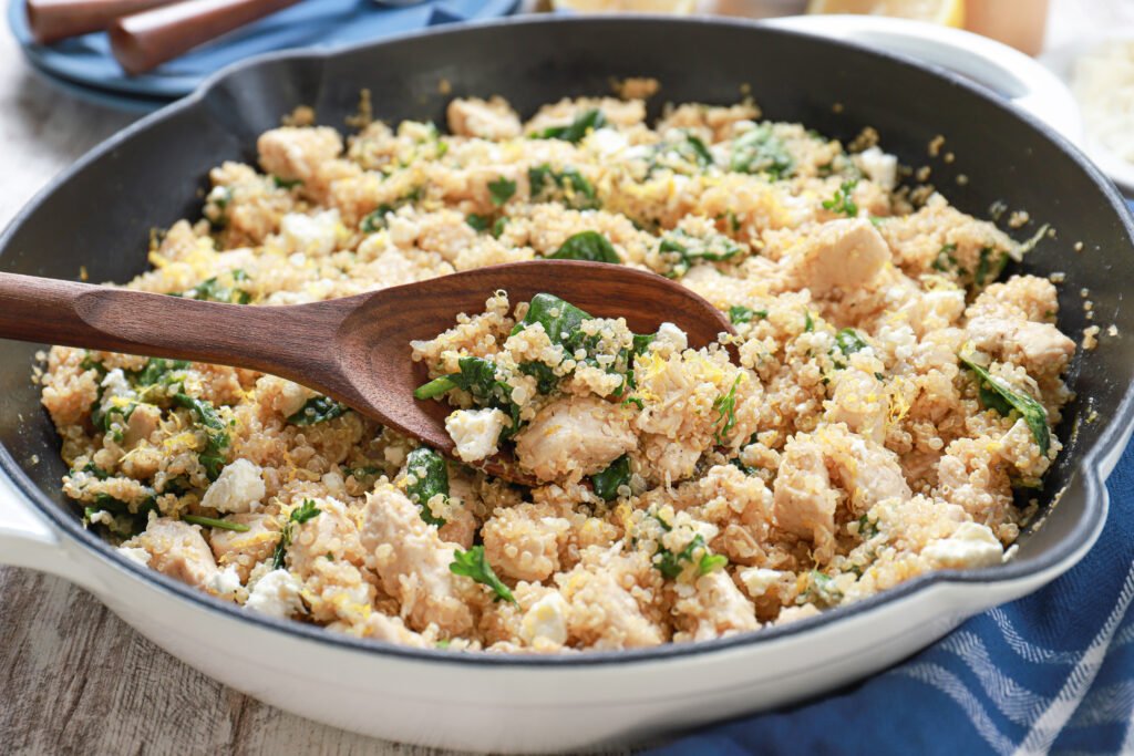 - Slice chicken and arrange over quinoa with avocado, tomatoes, and greens.