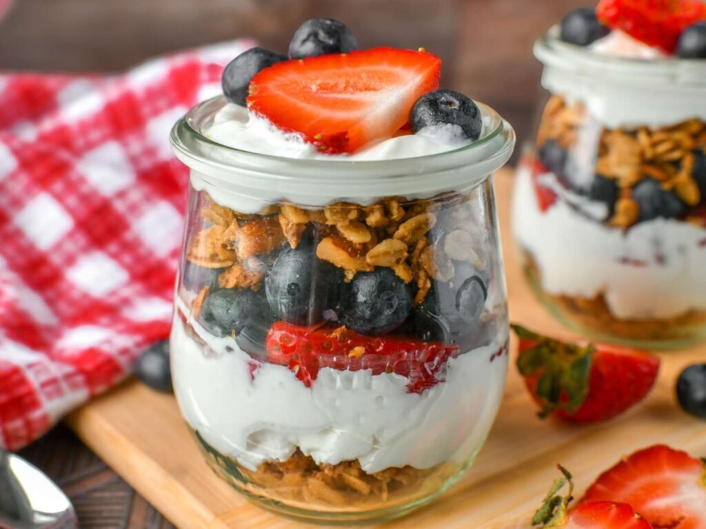 - Layer Greek yoghurt with berries in a glass or bowl.